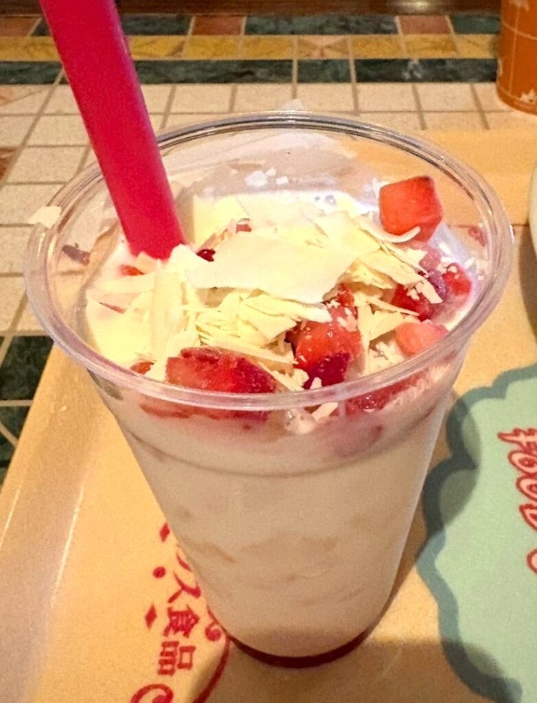 最後に↓の写真はアラビアンコーストにあるハウス食品が提供する”カスバ・フードコート”のスペシャルラッシー(ストロベリー&ホワイトチョコレート)とビーフカリーです!このスペシャルラッシーは2025年クリスマスシーズン限定で販売されてました。見た目がとても可愛い🍓。